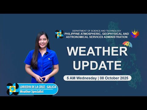 Public Weather Forecast issued at 5 AM | October 08, 2025 - Wednesday DOST-PAGASA Weather Specialist: Loriedin De La Cruz #weatherreport #dostpagasa PAGASA Weather Report (Subscribe for more weather updates) Facebook Page (Like): / pagasa.dost.gov.ph Twitter (Follow): / dost_pagasa Website (Visit): https://ift.tt/lF6vBfp Customer Satisfaction Survey (Feedback): https://shorturl.at/Do3VX