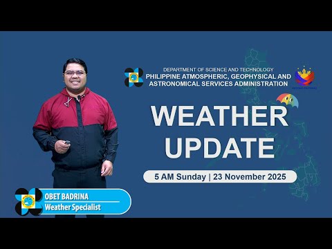 Public Weather Forecast issued at 5 PM | November 22, 2025 - Saturday DOST-PAGASA Weather Specialist: Munir Baldomero #weatherreport #dostpagasa PAGASA Weather Report (Subscribe for more weather updates) Facebook Page (Like): / pagasa.dost.gov.ph Twitter (Follow): / dost_pagasa Website (Visit): https://ift.tt/YeTFcSk Customer Satisfaction Survey (Feedback): https://shorturl.at/Do3VX