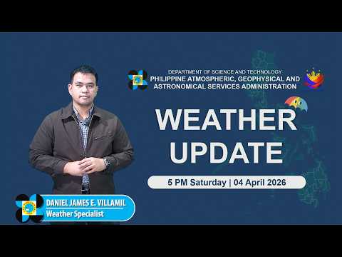 Public Weather Forecast issued at 5:00 PM | April 04, 2026 - Saturday DOST-PAGASA Weather Specialist: Daniel James E. Villamil #weatherreport #dostpagasa PAGASA Weather Report (Subscribe for more weather updates) Facebook Page (Like): / pagasa.dost.gov.ph Twitter (Follow): / dost_pagasa Website (Visit): https://ift.tt/QFyWAlh